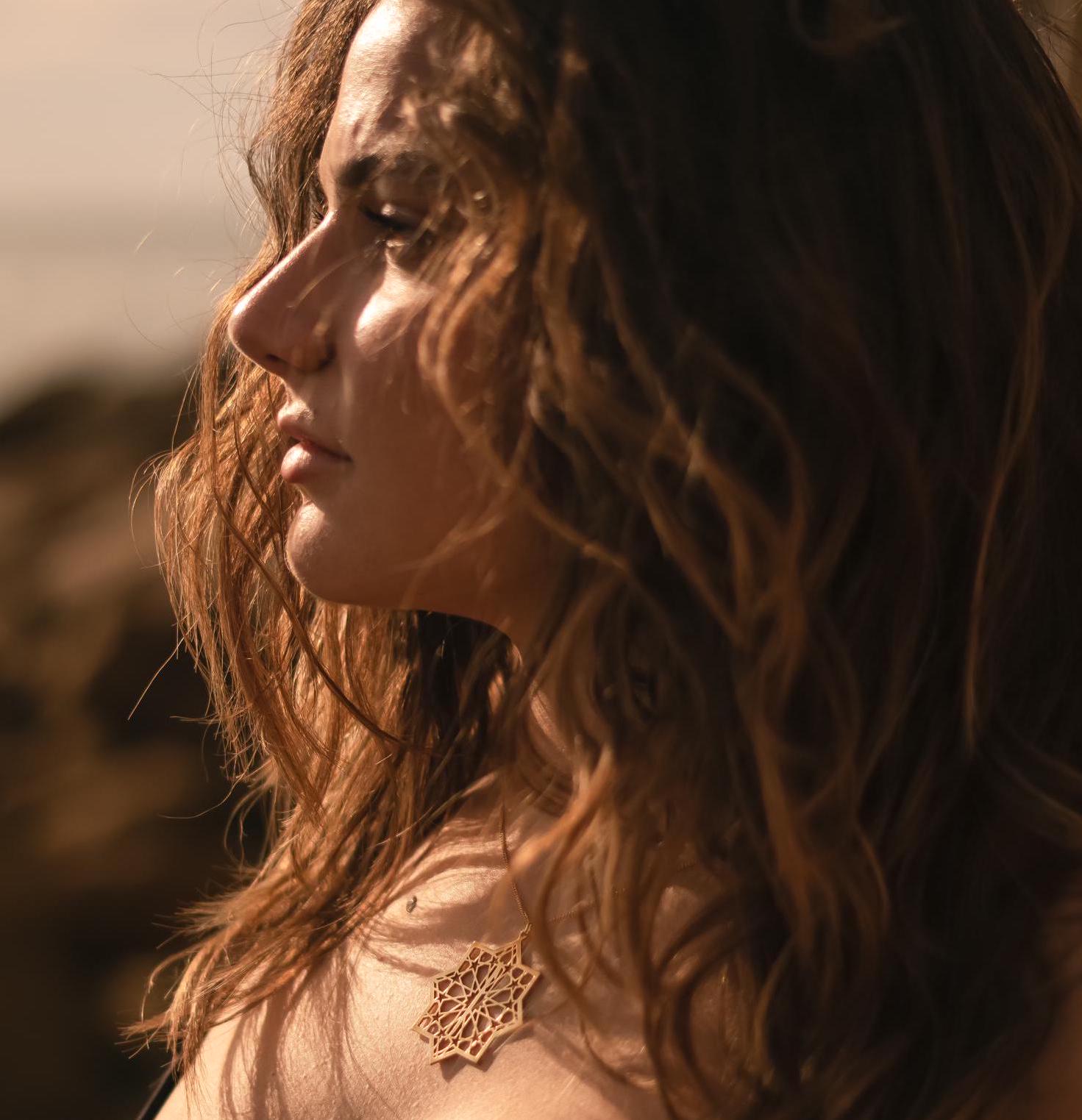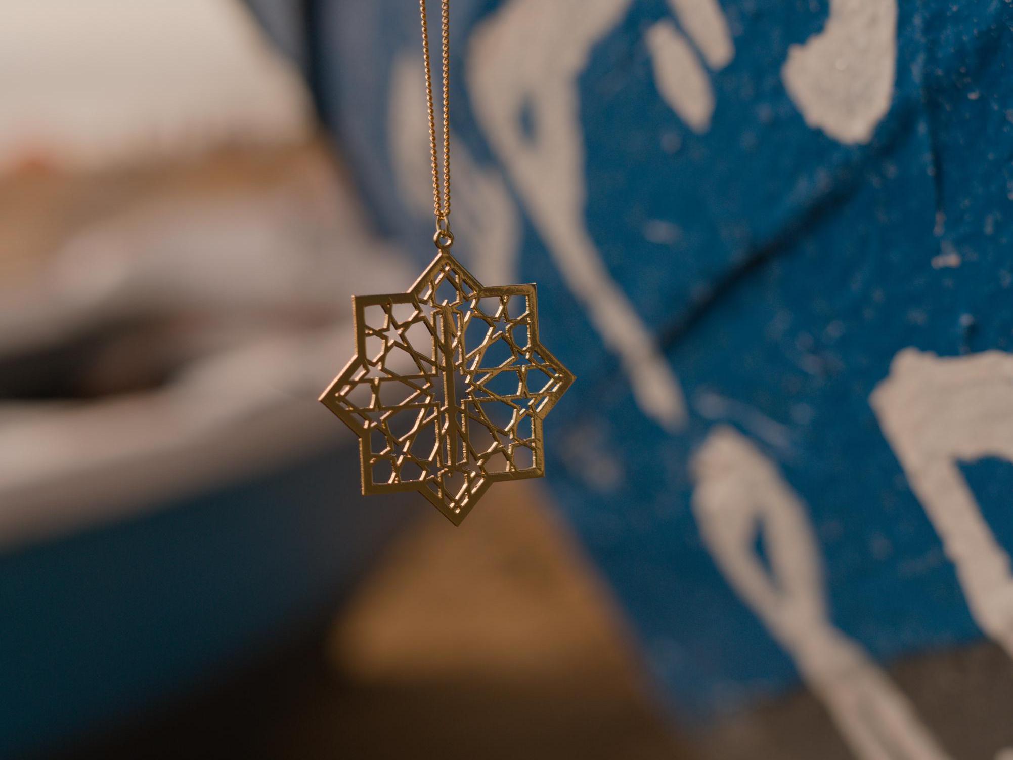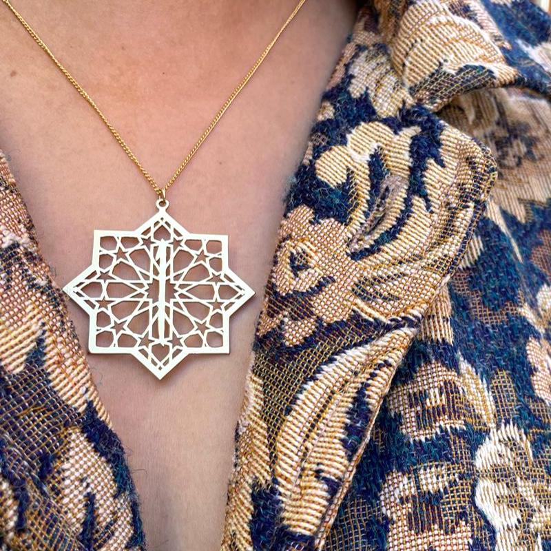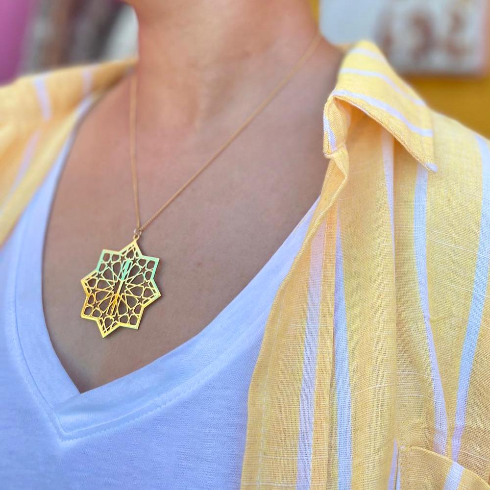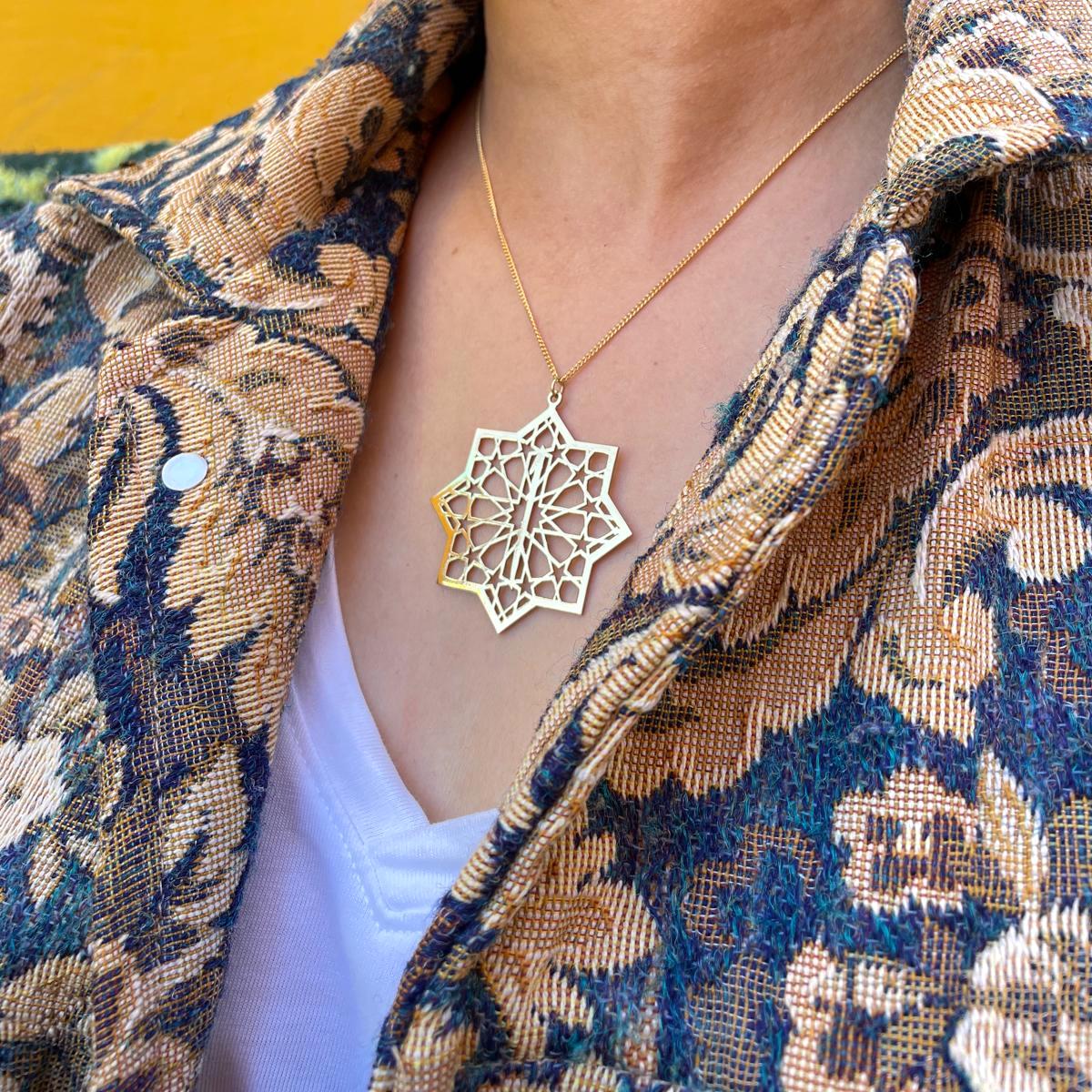 Collier doré 24 carats avec pendentif étoile islamique ajourée et la lettre Alif. Un bijou poétique, spirituel et lumineux, fabriqué à la main.
